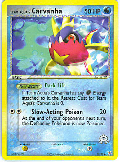 | Type | Water | | Pokemon serie | Team Aqua-Team Magma | | Stadie | Basic | | HP | 50 | | Sjældenhed | Uncommon | | Tilbagetrækning | 1 | | Svaghed | L | | Kortnummer | 25 | | Evne | [CC] Slow-Acting Poison (20) At the end of your opponent's next turn, the Defending Pokemon is now Poisoned.