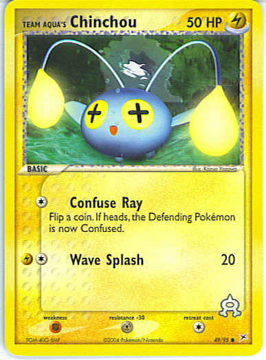 | Type | Lightning | | Pokemon serie | Team Aqua-Team Magma | | Stadie | Basic | | HP | 50 | | Sjældenhed | Common | | Tilbagetrækning | 1 | | Modstand | M | | Svaghed | F | | Kortnummer | 49 | | Evne | [C] Confuse Ray - Flip a coin. If heads, the Defending Pokemon is now Confused. [CL] Wave Splash (20)