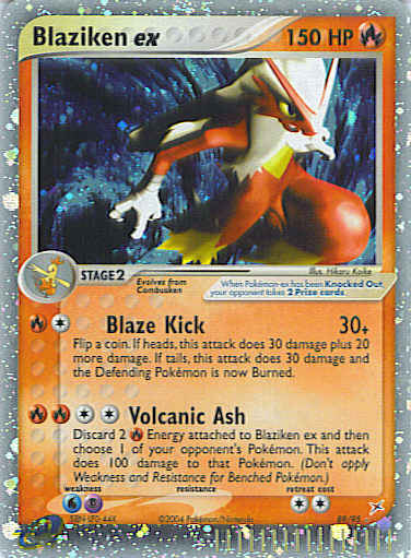 | | Evne2 | [CR] Blaze Kick (30+) Flip a coin. If heads, this attack does 30 damage plus 20 more damage. If tails, this attack does 30 damage and the Defending Pokemon is now Burned. [CCRR] Volcanic Ash - Discard 2 R Energy attached to Blaziken ex and then choose 1 of your opponent's Pokemon. This attack does 100 damage to that Pokemon. (Don't apply Weakness and Resistance for Benched Pokemon.)