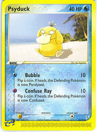 | | Evne2 | [W] Bubble (10) Flip a coin. If heads, the Defending Pokemon is now Paralyzed. [P] Confuse Ray (10) Flip a coin. If heads, the Defending Pokemon is now Confused.