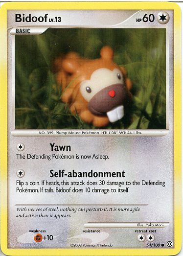 [C] Self-abandonment - Flip a coin. If heads, this attack does 30 damage to the Defending Pokemon. If tails, Bidoof does 10 damage to itself.
