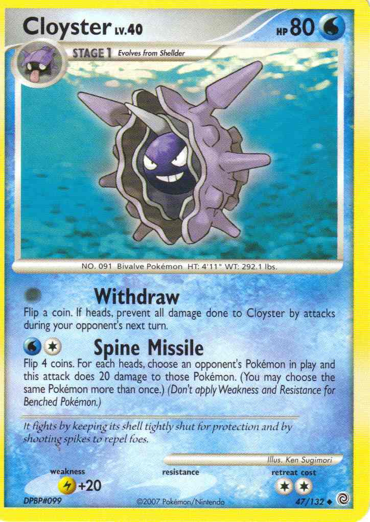 | | Evne2 | [0] Withdraw - Flip a coin. If heads, prevent all damage done to Cloyster by attacks during your opponent's next turn. [CW] Spine Missile - Flip 4 coins. For each heads, choose an opponent's Pokemon in play and this attack does 20 damage to those Pokemon. (You may choose the same Pokemon more than once.) (Don't apply Weakness and Resistance for Benched Pokemon.)