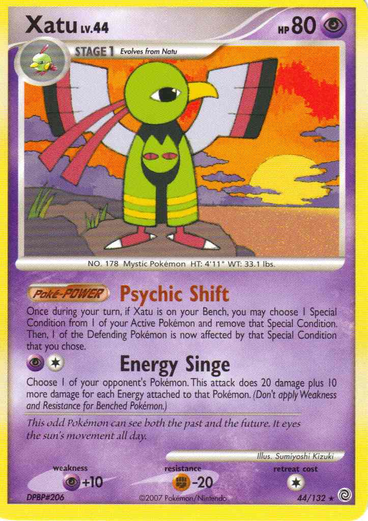 | Type | Psychic | | Pokemon serie | Secret Wonders | | Stadie | Stage 1 | | HP | 80.0 | | Sjældenhed | Rare | | Tilbagetrækning | 1.0 | | Modstand | F-20 | | Svaghed | P+10 | | Kortnummer | 44 | | Evne |