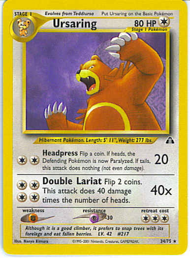 | Type | Colorless | | Pokemon serie | Neo Discovery | | Stadie | Stage 1 | | HP | 80 | | Sjældenhed | Rare | | Tilbagetrækning | 3 | | Modstand | P | | Svaghed | F | | Kortnummer | 34 | | Evne |