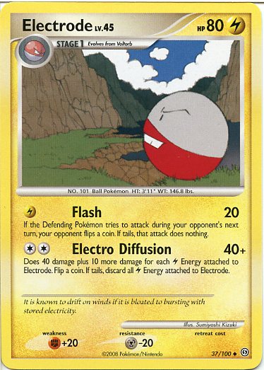 | Type | Lightning | | Pokemon serie | Stormfront | | Stadie | Stage 1 | | HP | 80.0 | | Sjældenhed | Uncommon | | Tilbagetrækning | 0.0 | | Modstand | M-20 | | Svaghed | F+20 | | Kortnummer | 37 | | Evne | [L] Flash (20) If the Defending Pokemon tries to attack during your opponent's next turn, your opponent flips a coin. If tails, that attack does nothing. [CC] Electro Diffusion (40+) Does 40 damage plus 10 more damage for each L Energy attached to Electrode. Flip a coin. If tails, discard all L Energy attached to Electrode.