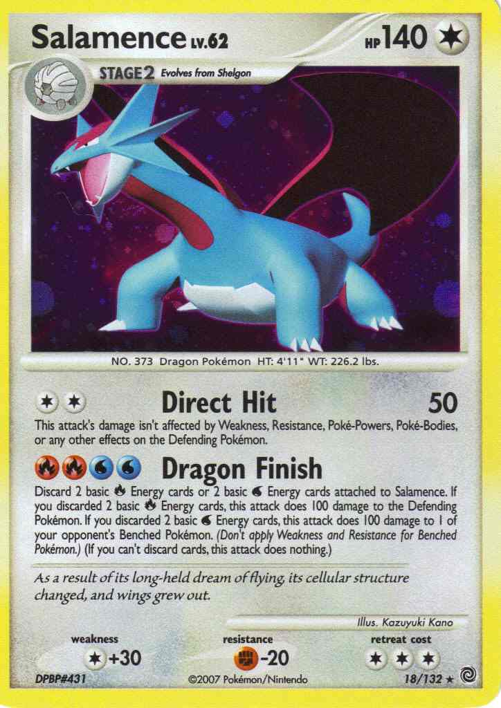 [RRWW] Dragon Finish - Discard 2 basic R Energy cards or 2 basic W Energy cards attached to Salamence. If you discarded 2 basic R Energy cards, this attack does 100 damage to the Defending Pokemon. If you discarded 2 basic W Energy cards, this attack does 100 damage to 1 of your opponent's Benched Pokemon. (Don't apply Weakness and Resistance for Benched Pokemon.) (If you can't discard cards, this attack does nothing.)