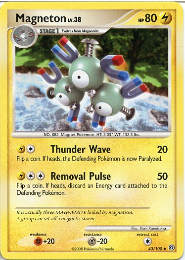 | Type | Lightning | | Pokemon serie | Stormfront | | Stadie | Stage 1 | | HP | 80.0 | | Sjældenhed | Uncommon | | Tilbagetrækning | 1.0 | | Modstand | M-20 | | Svaghed | F+20 | | Kortnummer | 43 | | Evne |