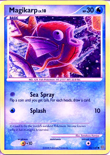 | Type | Water | | Pokemon serie | Stormfront | | Stadie | Basic | | HP | 30.0 | | Sjældenhed | Common | | Tilbagetrækning | 1.0 | | Svaghed | L+10 | | Kortnummer | 65 | | Evne |