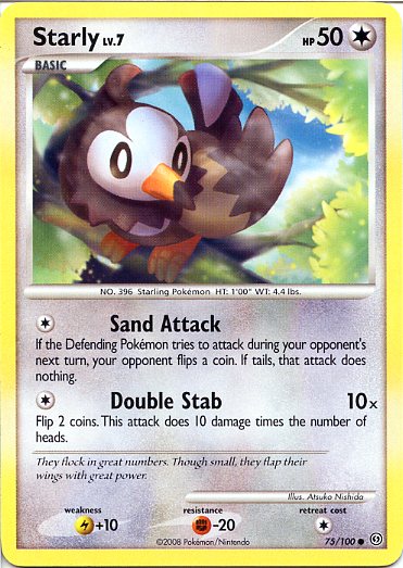 | Type | Colorless | | Pokemon serie | Stormfront | | Stadie | Basic | | HP | 50.0 | | Sjældenhed | Common | | Tilbagetrækning | 1.0 | | Modstand | F-20 | | Svaghed | L+10 | | Kortnummer | 75 | | Evne |