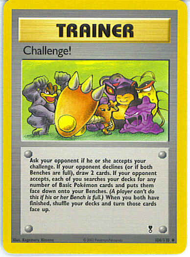 Evne Ask your opponent if he or she accepts your challenge. If your opponent declines (or if both Benches are full), draw 2 cards. If your opponent accepts, each of you searches your decks for any number of Basic Pokemon cards and puts them face down onto your Benches. (A player can't do this if his or her Bench is full.) When you both have finished, shuffle your decks and turn those cards face up.