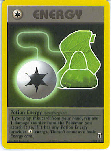 If you play this card from your hand, remove 1 damage counter from the Pokemon you attach it to, if it has any. Potion Energy provides 1 Colorless energy. (Doesn't count as a basic Energy card.)
