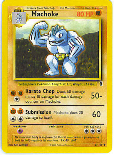 | Type | Fighting | | Pokemon serie | Legendary Collection | | Stadie | Stage 1 | | HP | 80 | | Sjældenhed | Uncommon | | Tilbagetrækning | 3 | | Svaghed | P | | Kortnummer | 51 | | Evne |