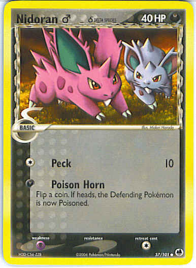 | Type | Darkness | | Pokemon serie | Dragon Frontiers | | Stadie | Basic | | HP | 40 | | Sjældenhed | Common | | Tilbagetrækning | 1 | | Svaghed | P | | Kortnummer | 57 | | Evne | [C] Peck (10) [D] Poison Horn - Flip a coin. If heads, the Defending Pokemon is now Poisoned.