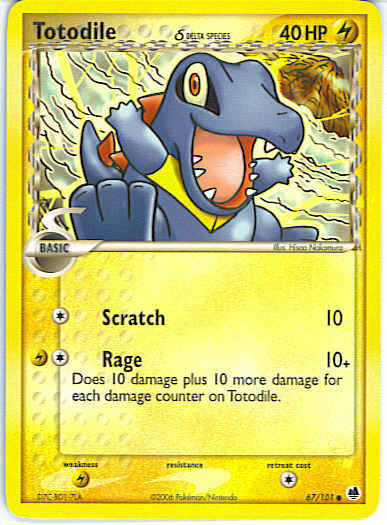 | Type | Lightning | | Pokemon serie | Dragon Frontiers | | Stadie | Basic | | HP | 40 | | Sjældenhed | Common | | Tilbagetrækning | 1 | | Svaghed | L | | Kortnummer | 67 | | Evne | [C] Scratch (10) [CL] Rage (10+) Does 10 damage plus 10 more damage for each damage counter on Totodile.