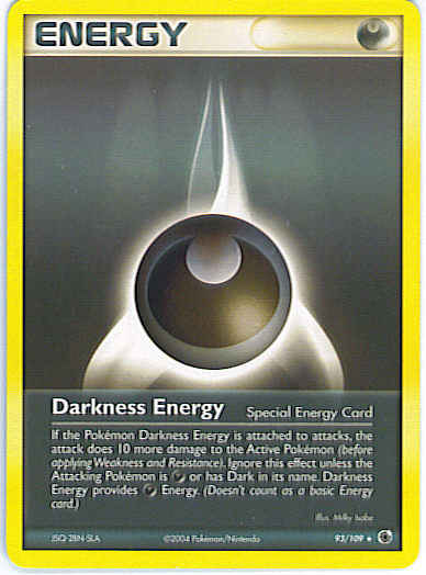 Evne If the Pokemon Darkness Energy is attached to attacks, the attack does 10 more damage to the Active Pokemon (before applying Weakness and Resistance). Ignore this effect unless the Attacking Pokemon is D or has Dark in its name. Darkness Energy provides D energy. (Doesn't count as a basic Energy card.)
