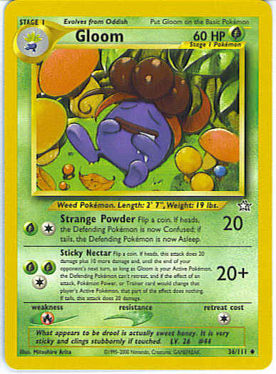 [CGG] Sticky Nectar (20+) Flip a coin. If heads, this attack does 20 damage plus 10 more damage and, until the end of your opponent's next turn, as long as Gloom is your Active Pokemon, the Defending Pokemon can't retreat, and if the effect of an attack, Pokemon Power, or Trainer card would change that player's Active Pokemon, that part of the effect does nothing. If tails, this attack does 20 damage.