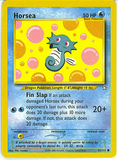 | Type | Water | | Pokemon serie | Neo Genesis | | Stadie | Basic | | HP | 50 | | Sjældenhed | Common | | Svaghed | L | | Kortnummer | 62 | | Evne |