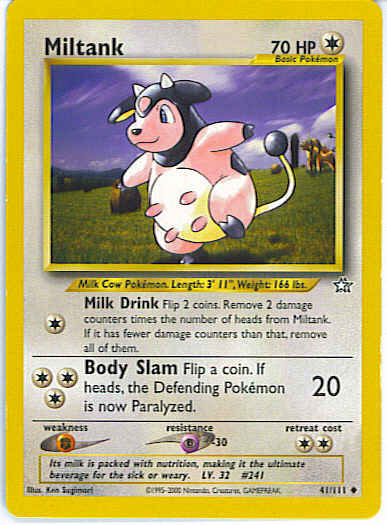 [C] Milk Drink - Flip 2 coins. Remove 2 damage counters times the number of heads from Miltank. If it has fewer damage counters than that, remove all of them.