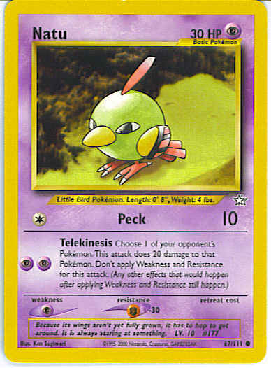 | Type | Psychic | | Pokemon serie | Neo Genesis | | Stadie | Basic | | HP | 30 | | Sjældenhed | Common | | Modstand | F | | Svaghed | P | | Kortnummer | 67 | | Evne |