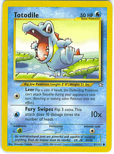 [C] Leer - Flip a coin. If heads, the Defending Pokemon can't attack Totodile during your opponent's next turn. (Benching or evolving either Pokemon ends this effect.)