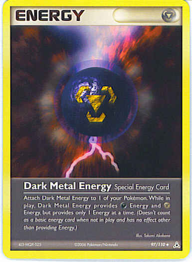 Attach Dark Metal Energy to 1 of your Pokemon. While in play, Dark Metal Energy provides D Energy and M Energy, but provides only 1 Energy at a time. (Doesn't count as a basic Energy card when not in play and has no effect other than providing Energy.)