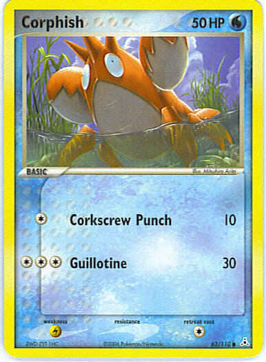 | Type | Water | | Pokemon serie | Holon Phantoms | | Stadie | Basic | | HP | 50 | | Sjældenhed | Common | | Tilbagetrækning | 1 | | Svaghed | L | | Kortnummer | 62 | | Evne | [C] Corkscrew Punch (10) [CCC] Guillotine (30) | | Evne2 | [C] Corkscrew Punch (10) [CCC] Guillotine (30) | | Kunstner | Atsuko Nishida |