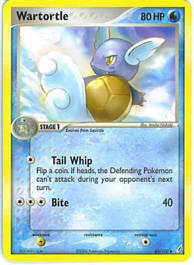 | Type | Water | | Pokemon serie | Crystal Guardians | | Stadie | Stage 1 | | HP | 80 | | Sjældenhed | Uncommon | | Tilbagetrækning | 1 | | Svaghed | L | | Kortnummer | 43 | | Evne | [C] Tail Whip - Flip a coin. If heads, the Defending Pokemon can't attack during your opponent's next turn. [CCC] Bite (40) | | Evne2 | [C] Tail Whip - Flip a coin. If heads, the Defending Pokemon can't attack during your opponent's next turn. [CCC] Bite (40) | | Kunstner | Atsuko Nishida |